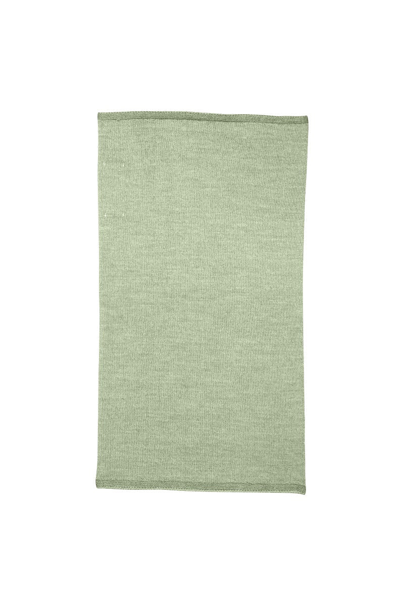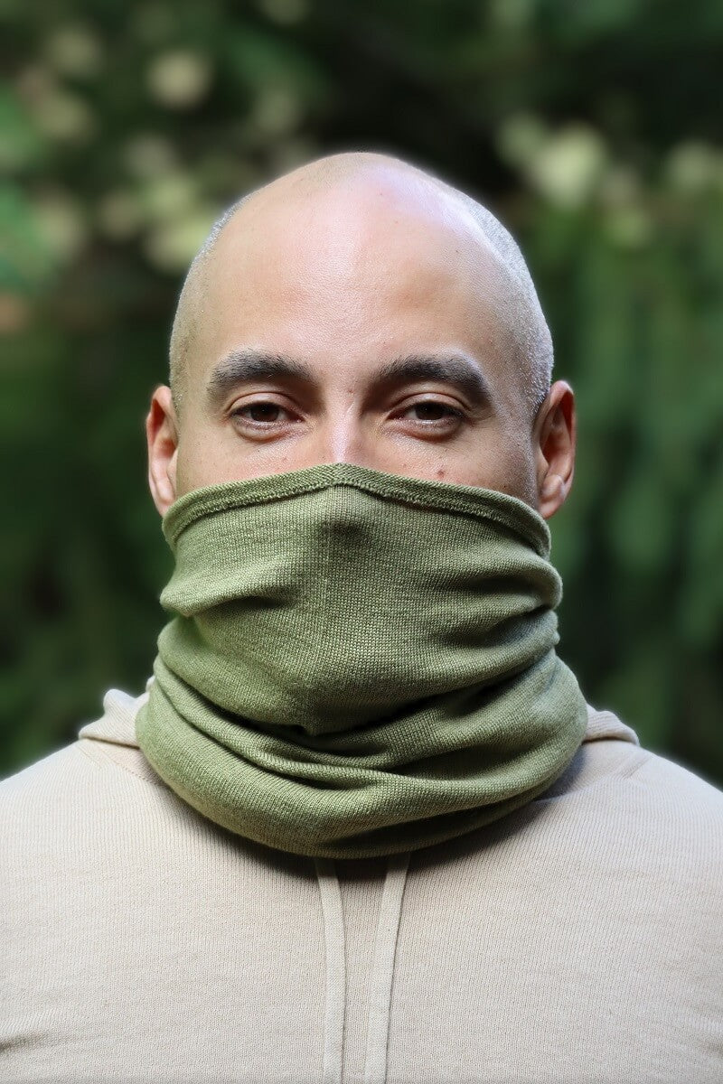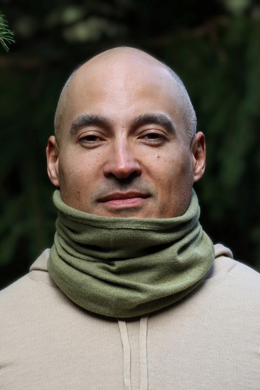 A thin merino neck gaiter that can be worn in a variety of ways – down, up, or as a headband. Small trim on both ends.